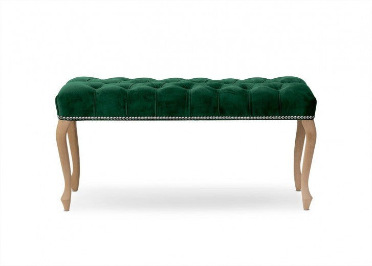 Banquette rembourrée avec pieds en tissu et bois de palmier, Velours Vert, l125xL47,5xH46,5 cm
