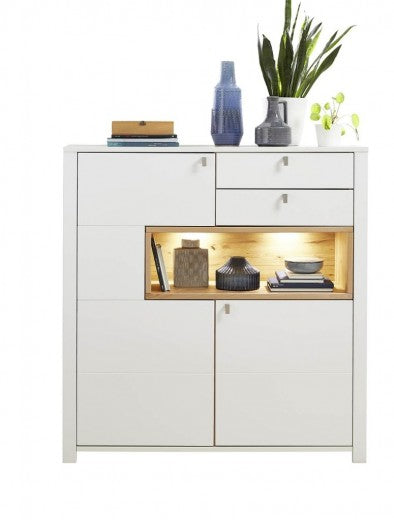 Meuble en bois aggloméré et MDF avec 2 tiroirs et 2 portes, Selina Blanc / Naturel, l132xA41xH138 cm