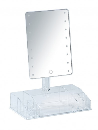 Miroir cosmétique de table, avec organisateur LED et plastique, Farnese Transparent, L27xl16xH36 cm