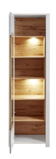 Vitrine en bois et MDF avec 1 porte, Selina Blanc / Naturel, l62xA41xH202 cm
