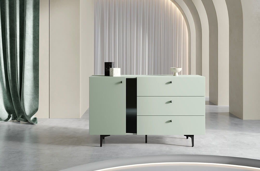 Commode en bois clair avec 1 porte et 3 tiroirs, Coloris Small CS 04, Vert Menthe / Noir, l138xL41xH84 cm
