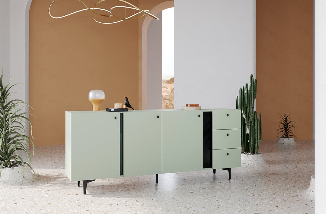 Commode en bois clair à 3 portes et 3 tiroirs, Coloris Large CS 03, Vert Menthe / Noir, l200xL41xH84 cm