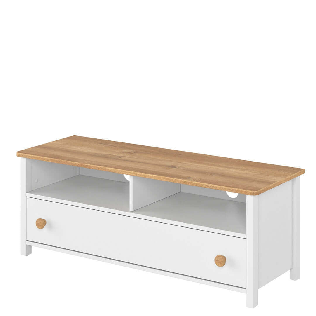 Commode TV en bois, avec 1 tiroir pour enfants et jeunes Story 13, Blanc/Chêne, l120xW42xH46 cm