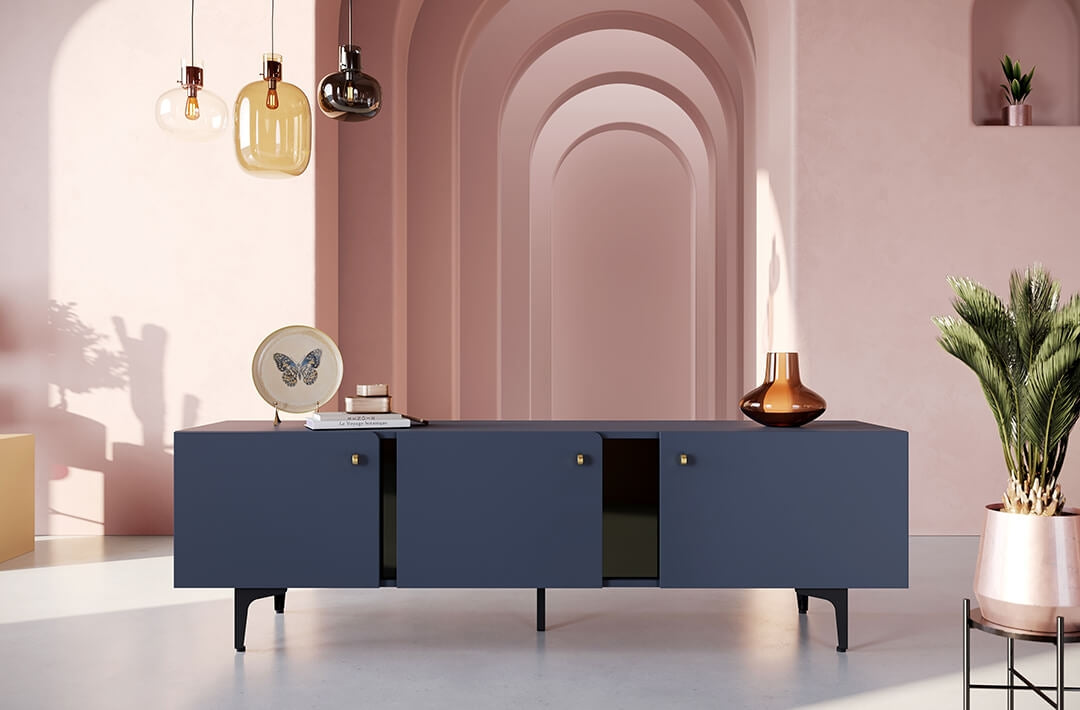 Commode TV en bois avec 3 portes, Colors Small CS 06, Bleu Marine Mat / Noir, L165xW41xH50 cm