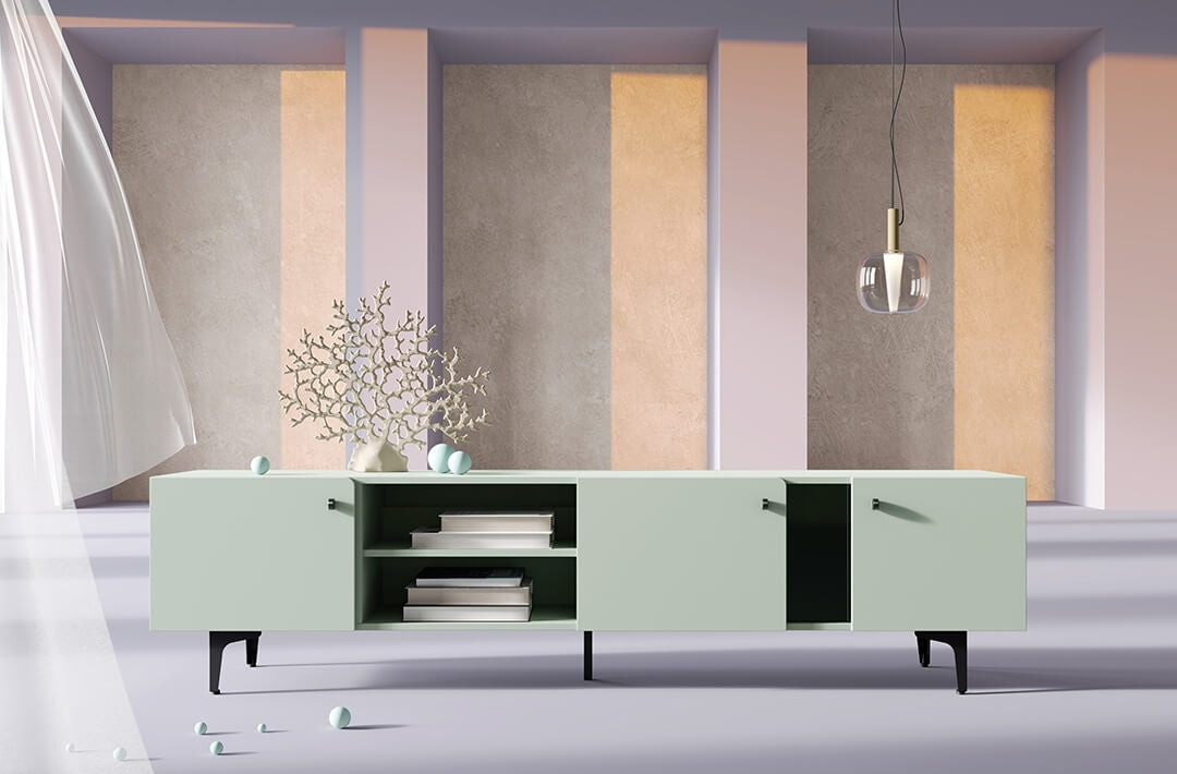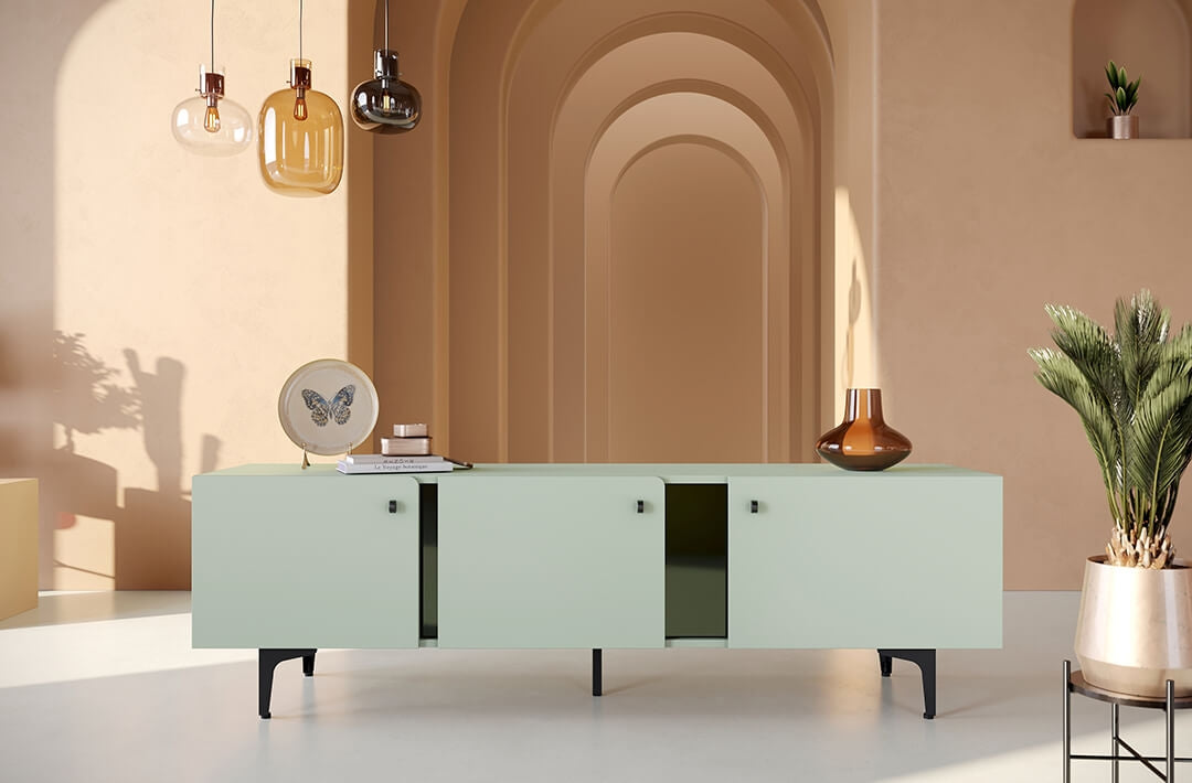 Commode TV en bois avec 3 portes, Colors Large CS 05, Vert Menthe / Noir, L200xW41xH50 cm
