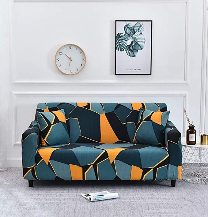 Housse de canapé élastique + 1 taie d'oreiller, Géométrique B046, Pétrole / Jaune