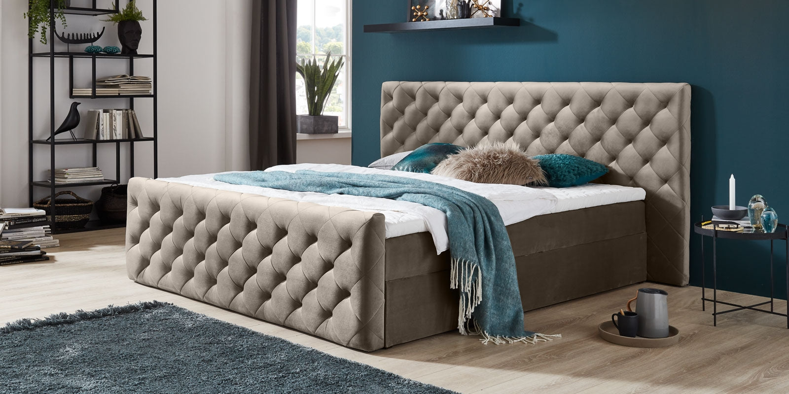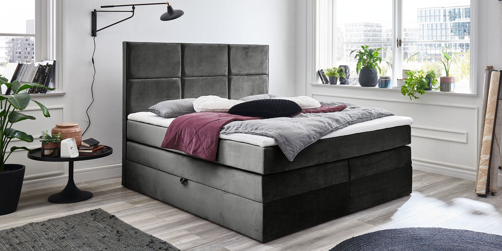 Lit pliant avec coffre de rangement, recouvert de tissu, Lauria, Boxspring Velvet, Grej