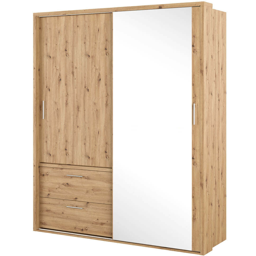 Armoire en bois clair, avec 2 portes coulissantes et miroir Arti 21, Chêne Artisan / Noir, L160xW57xH218 cm