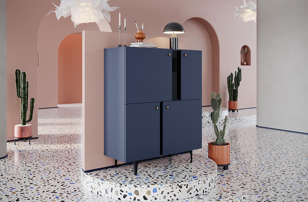 Armoire 4 portes en bois clair, Coloris CS 01, Bleu marine mat / Noir, L105xl41xH127 cm