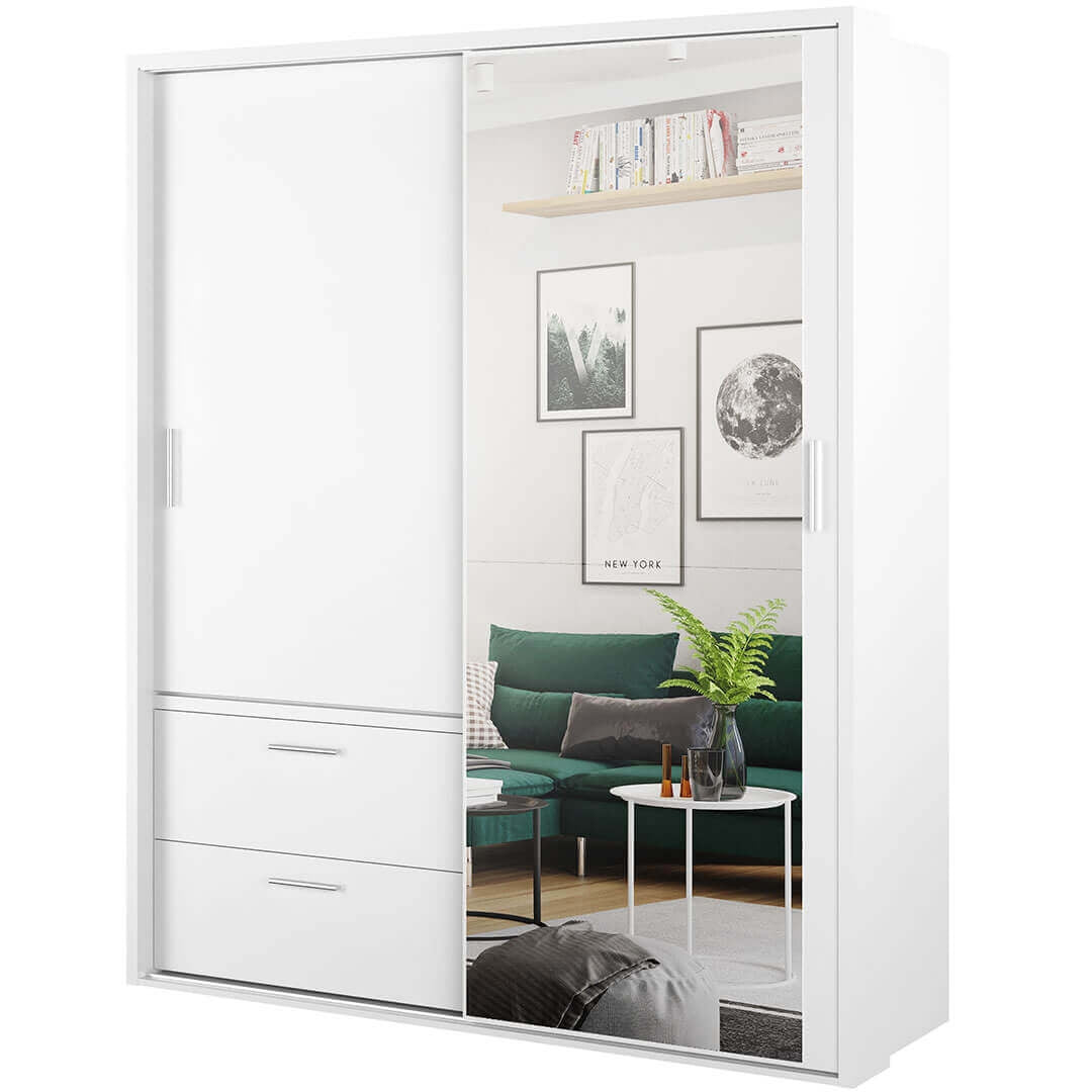 Armoire en bois clair, avec 2 portes coulissantes, 2 tiroirs et miroir Arti 22, Blanc Mat, L180xW63xH215 cm