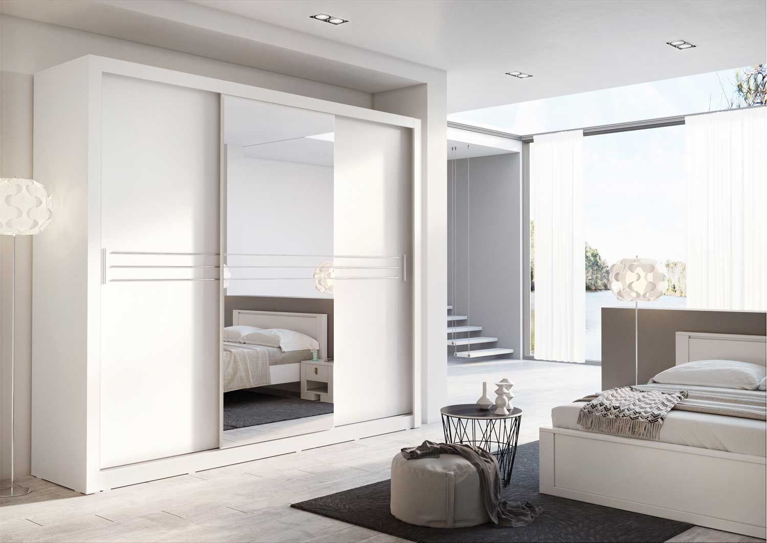 Armoire en bois clair avec 3 portes coulissantes et miroir Idea 11, Blanc mat, L250xP60xH215 cm