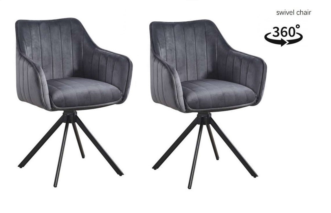Lot de 2 chaises pivotantes recouvertes de tissu et pieds en métal, Alex, Velours Gris/Noir, L45xL59xH86 cm