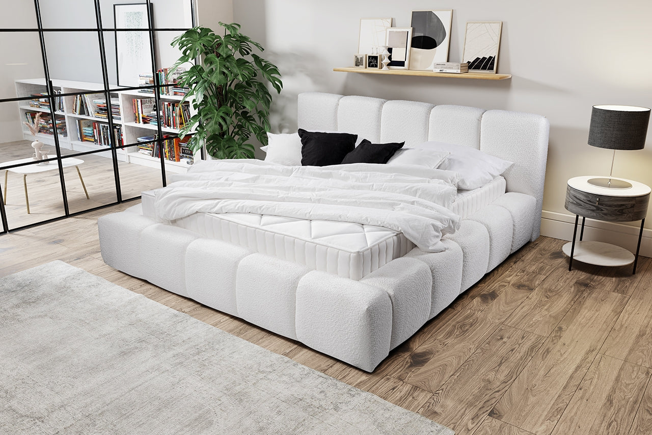 Lit rembourré avec tissu bouclé, Cadre de lit pliant avec espace de rangement, Baloo Blanc