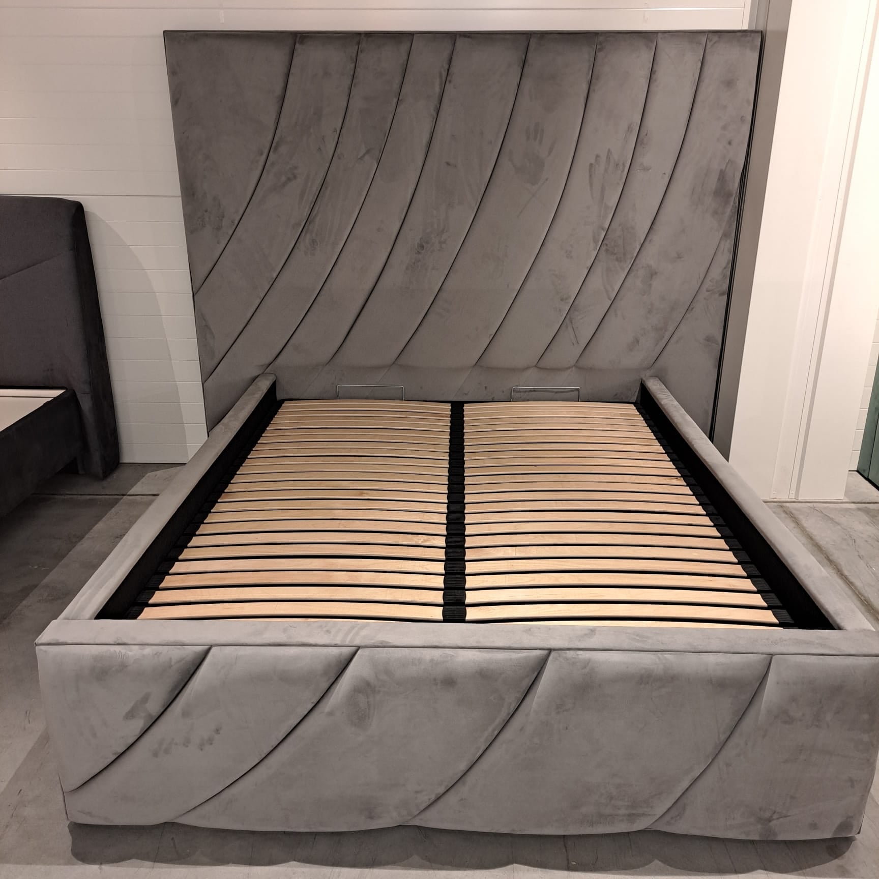 Lit rembourré en tissu, Cadre de lit pliant avec espace de rangement, Belleza Gris