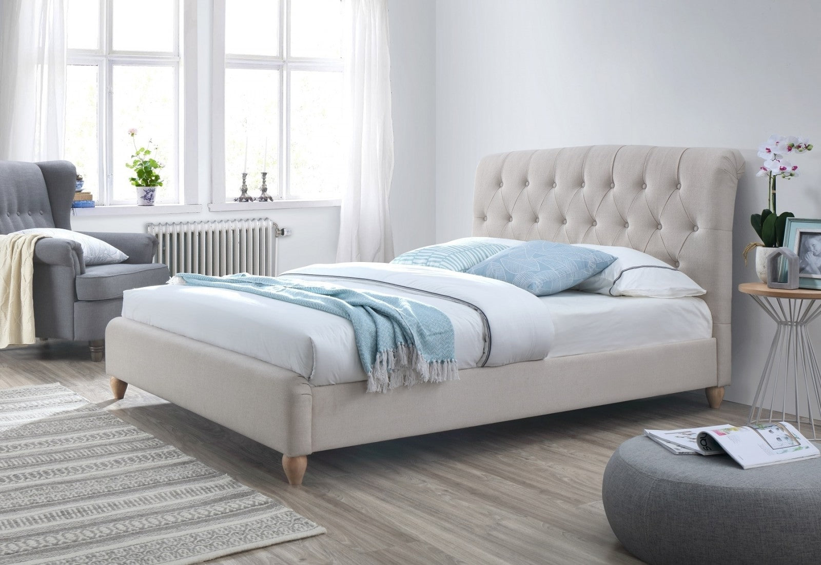 Lit rembourré en tissu, Cadre de lit pliant avec espace de rangement, Lugano, Beige