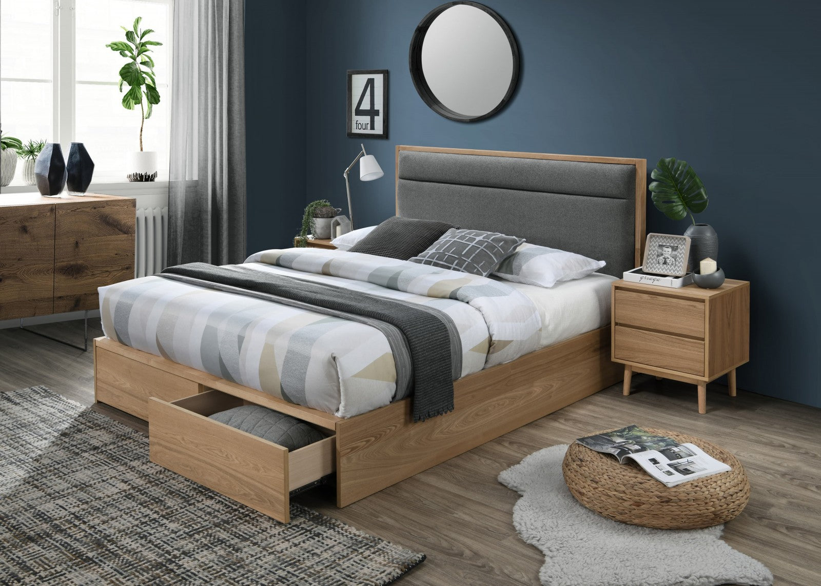 Lit en placage, recouvert de tissu et 2 tiroirs, Blossoms, Gris Foncé