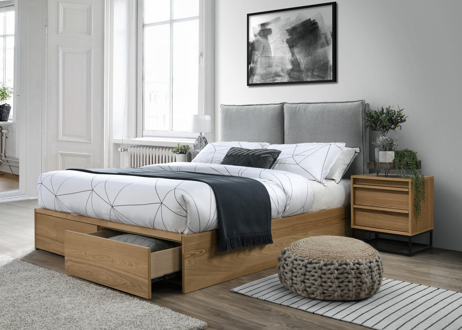 Lit en placage et aggloméré, recouvert de tissu Gris Velvet / Rustic Oak