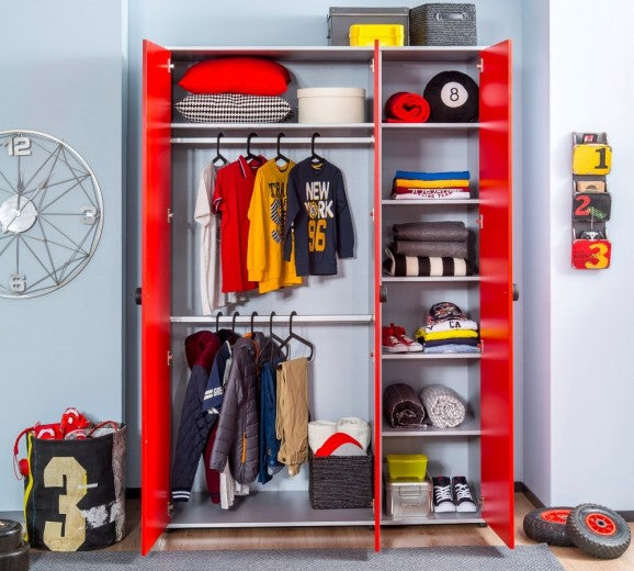 Dulapul din pal cu 3 usi, pentru copii Race Cup Red / Light Blue, imbina armonios estetica, functionalitatea si rezistenta.