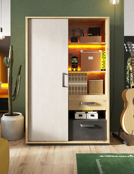 Armoire en bois clair, avec 1 porte, 2 tiroirs et LED incluses, pour enfants et jeunes, Qubic 05, Chêne Artisan / Noir / Gris, L90xW42xH138 cm
