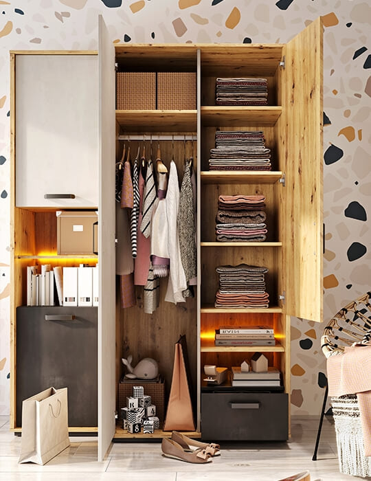 Armoire en bois clair avec 2 portes, 1 tiroir et LED inclus, pour enfants et adolescents, Qubic 03 Medium, Chêne Artisan / Gris / Noir, L90xW52xH195 cm