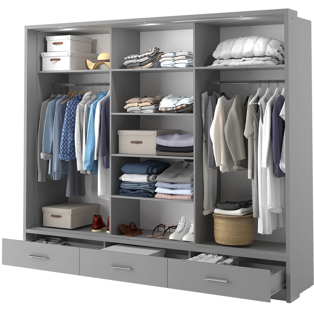 Armoire en bois clair, avec 3 portes coulissantes, 3 tiroirs et miroir Arti 01 Triple, Gris Mat, L250xW63xH215 cm