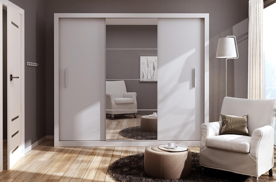 Armoire en bois clair avec 3 portes coulissantes et miroir Idea 01, Blanc mat, L250xP60xH215 cm