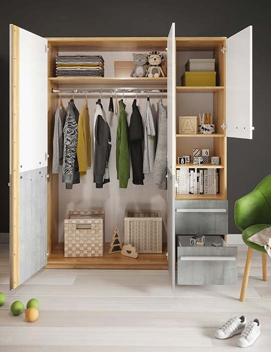 Armoire en bois clair avec 3 portes et 2 tiroirs, pour enfants et adolescents, Plano 01, Chêne/Gris/Blanc, L150xl51xH191 cm