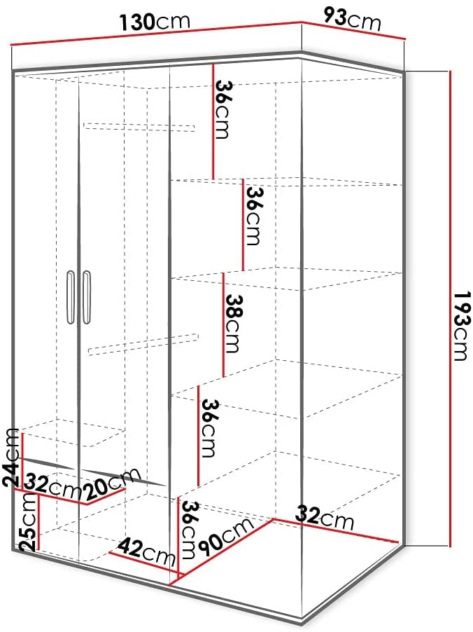 L'armoire contient 6 étagères, 2 rails, miroir et led.