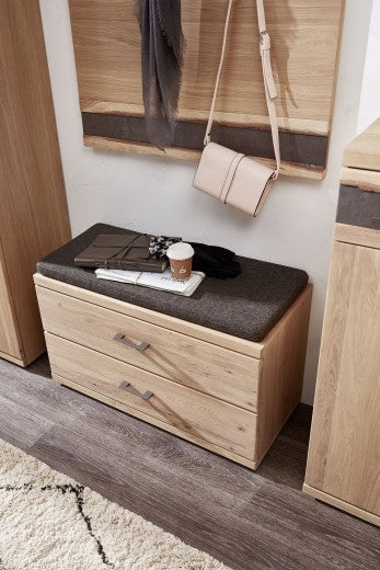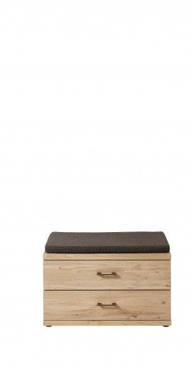 Banc rembourré avec tissu et 2 tiroirs, placage et bois, Crispin Natur, l84xA39xH54 cm