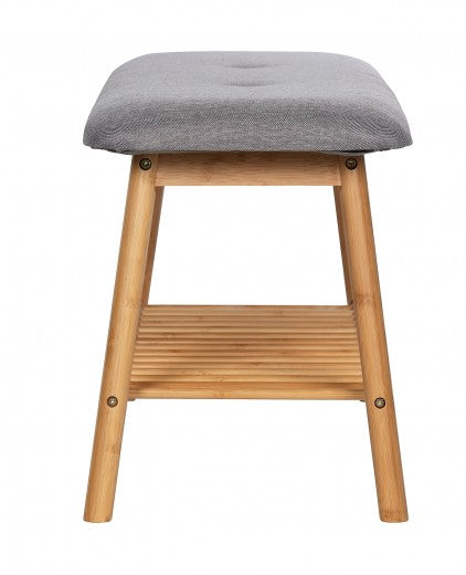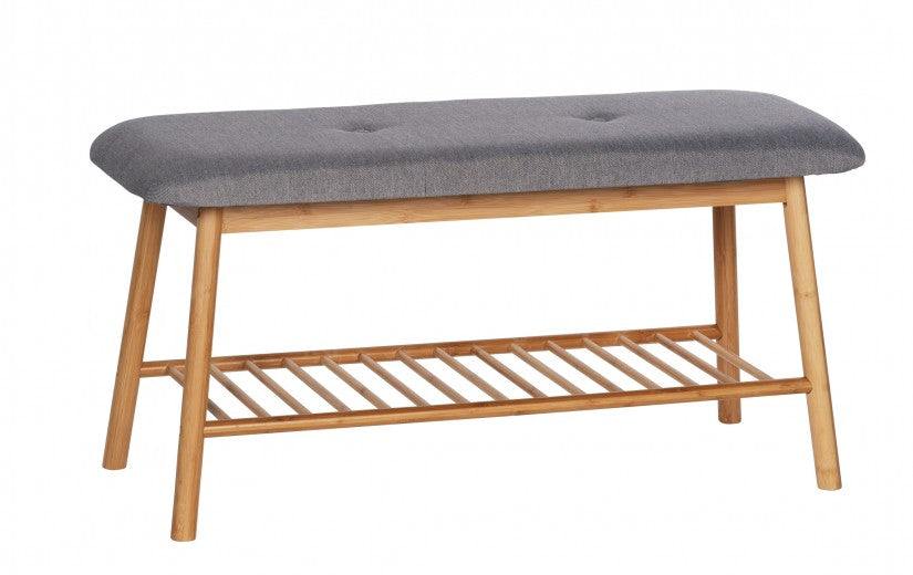 Banc rembourré avec tissu et pieds en bambou, avec porte-chaussures, Bahari Naturel / Gris, l90xA34xH45 cm