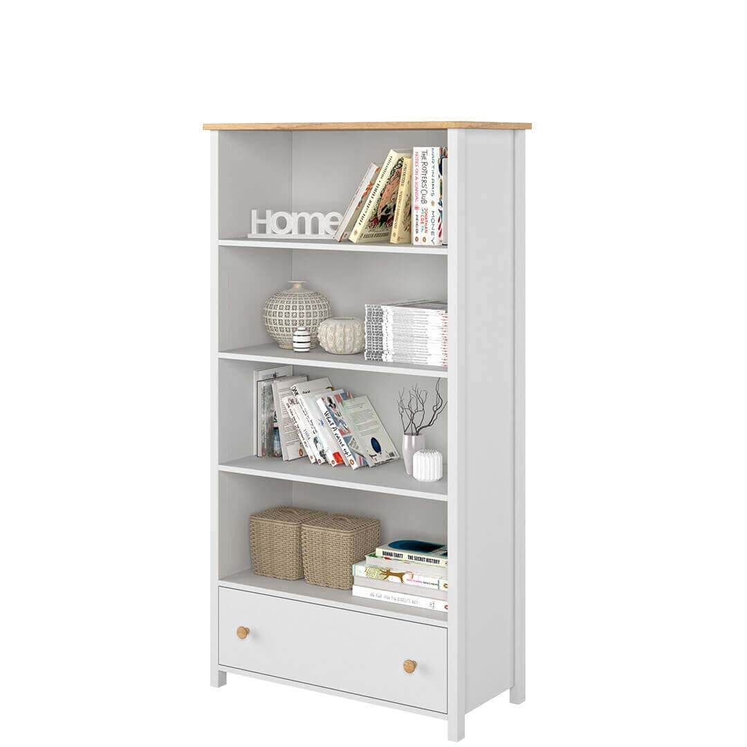 Bibliothèque en bois avec 1 tiroir, pour enfants et jeunes, Story 02, Blanc / Chêne, L85xW42xH161 cm