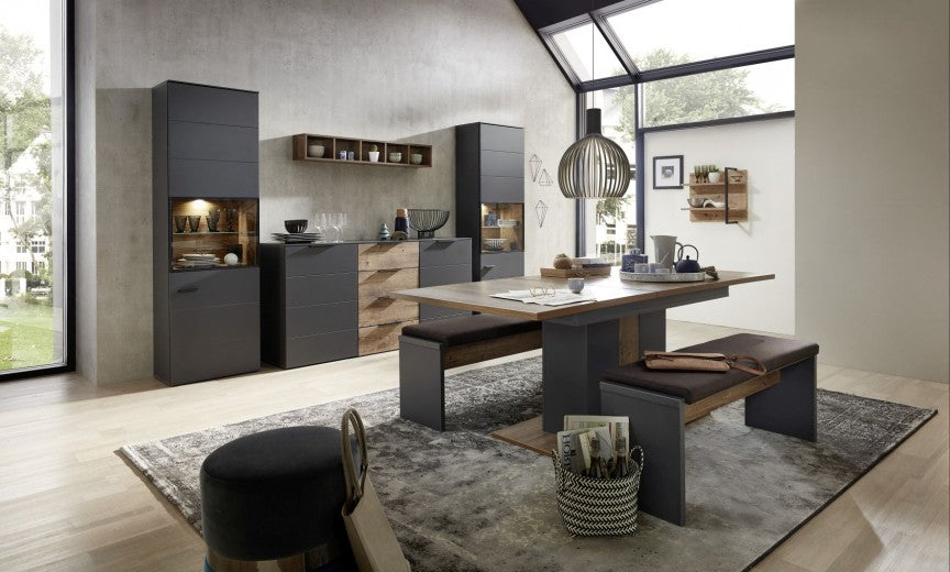 La collection Madeline est spécialement créée pour aménager un salon ou une salle à manger moderne et élégant, construit avec une attention particulière aux détails. La multitude de détails élégants associés aux tons blanc, chêne et gris foncé souligne le caractère original de cette collection.