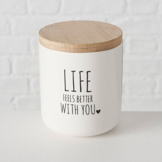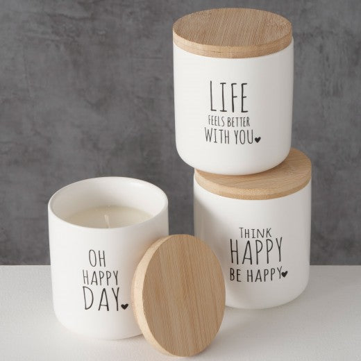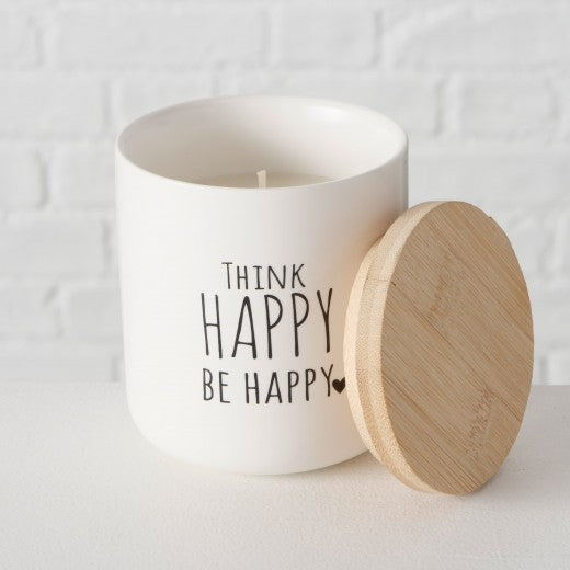 Le produit est fait de cire et de céramique, avec un couvercle en bambou.