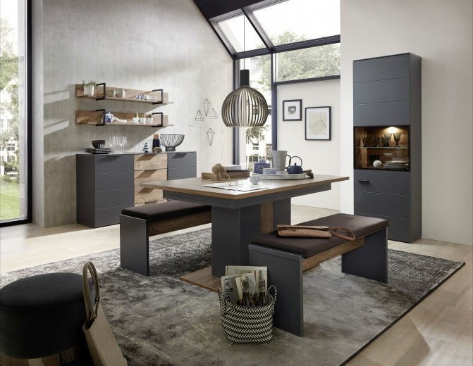La collection Madeline est spécialement créée pour aménager un salon ou une salle à manger moderne et élégant, construit avec une attention particulière aux détails. La multitude de détails élégants associés aux tons blanc, chêne et gris foncé souligne le caractère original de cette collection.