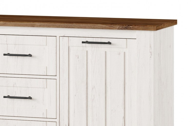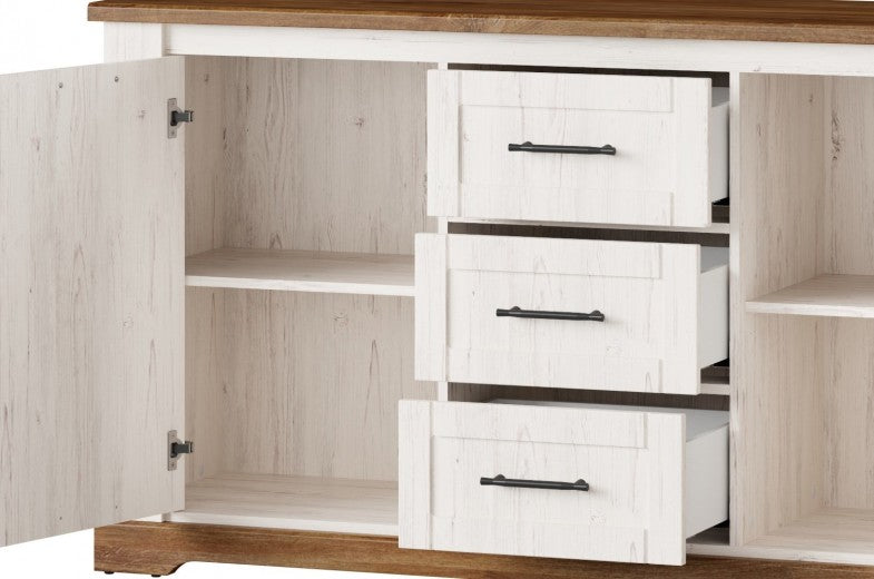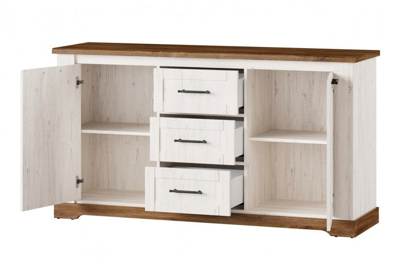 Commode, avec 3 tiroirs et 2 portes Country 45 Blanc / Chêne, l163xA45xH89 cm