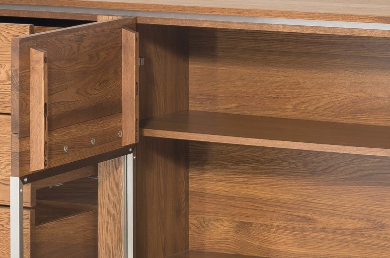 Commode avec vitrine en bois et placage, 4 tiroirs et 2 portes, LED incluse Monténégro 47 Chêne Rustique, l180xA42xH87 cm
