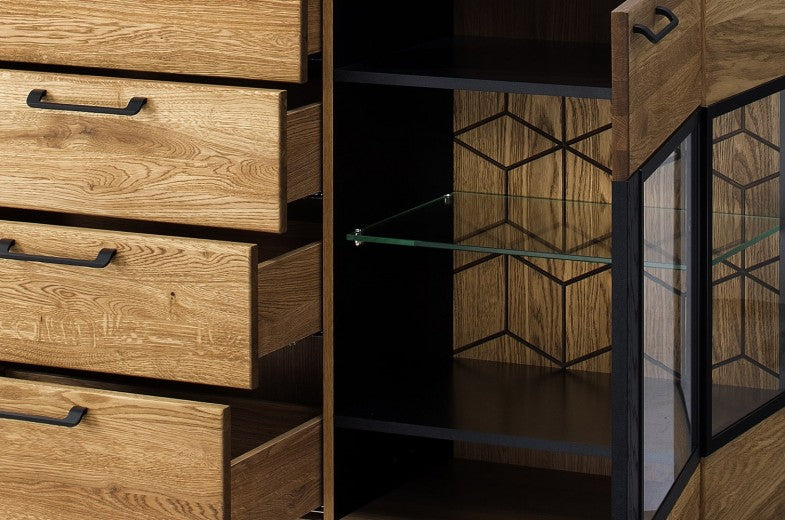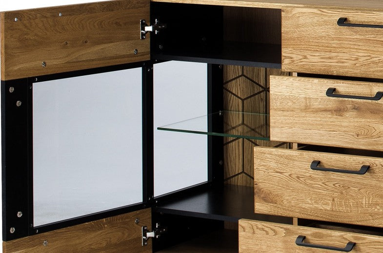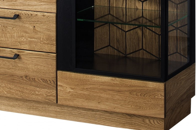 Commode avec vitrine en bois et placage, 4 tiroirs et 2 portes, LED incluse Mosaic 47 Chêne / Noir, l170xA42xH90 cm