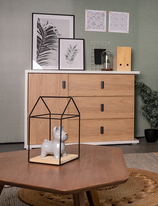 Commode en bois avec 1 porte et 3 tiroirs, pour enfants et jeunes, Simi 05, Naturel / Blanc, L135xW41xH90 cm