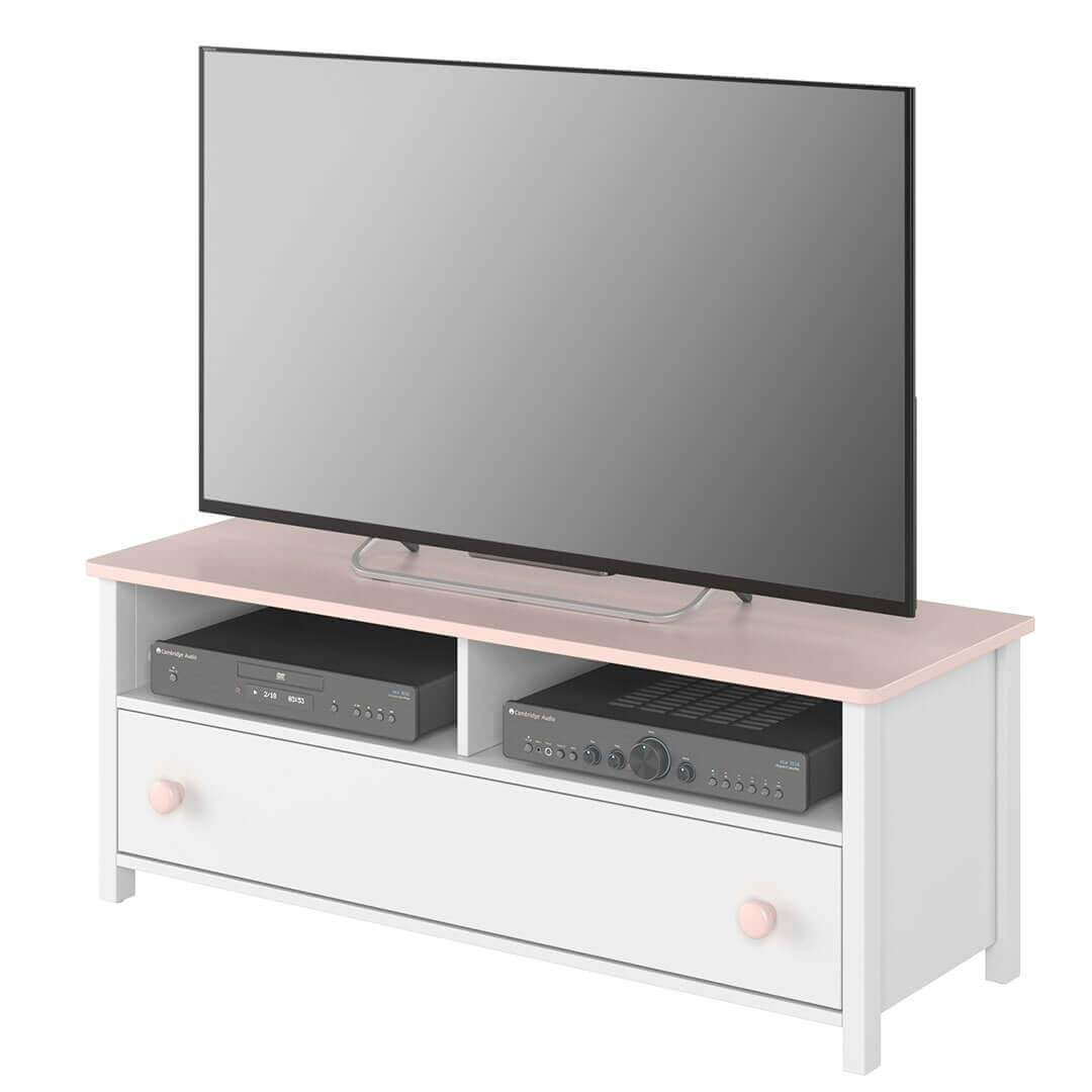 Commode TV en bois, avec 1 tiroir pour enfants et jeunes Luna 13, Blanc/Rose, l120xW42xH46 cm