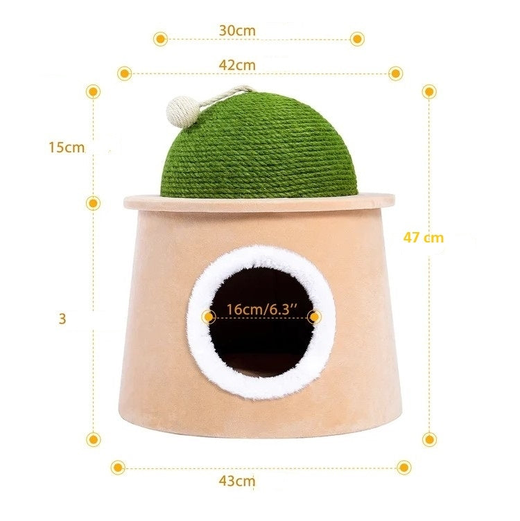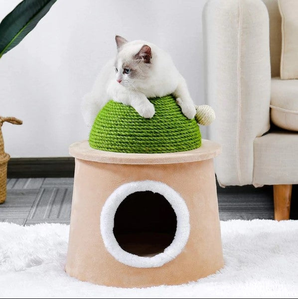 L'ensemble de jeu pour chats possède à la fois une cachette confortable dans la partie inférieure et une partie amovible dans la partie supérieure, enveloppée de sisal, adaptée à l'aiguisage des griffes. La base solide ne permet pas à l'ensemble de se renverser.