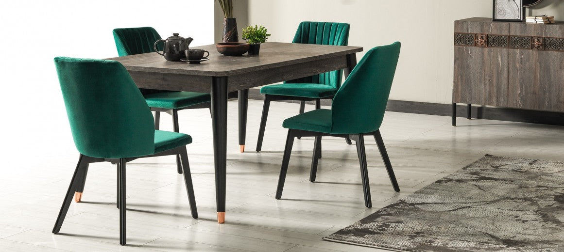 - 4 chaises rembourrées avec tissu et pieds en bois Wella Green / Black, largeur: 46 cm, profondeur: 48 cm, hauteur totale: 87 cm, hauteur d'assise: 47 cm, poids: 8 kg