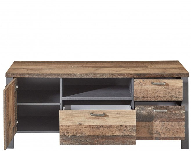 - 1 commode TV en bois, avec 3 tiroirs et 1 porte Chelsea, dimensions : largeur : 154 cm, profondeur : 50 cm, hauteur : 62 cm, poids : 65 kg