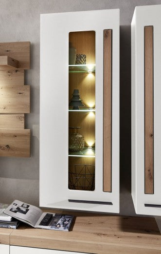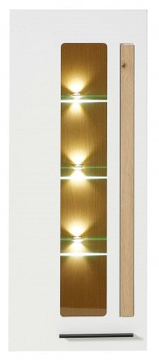 - 1 vitrine suspendue en MDF, avec 1 porte et LED inclus Loftis Blanc / Chêne, dimensions : largeur : 52 cm, profondeur : 37 cm, hauteur : 128 cm, poids : 33 kg