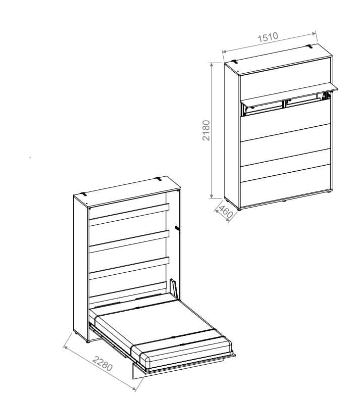 Dimensions extérieures du lit : largeur : 151 cm, profondeur : 46 cm, hauteur au mur : 218 cm, longueur déployée : 228 cm, poids : 155 kg
