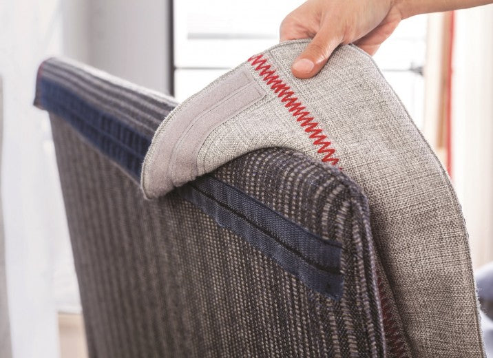 La tête de lit est recouverte de tissu et a un oreiller réversible attaché.