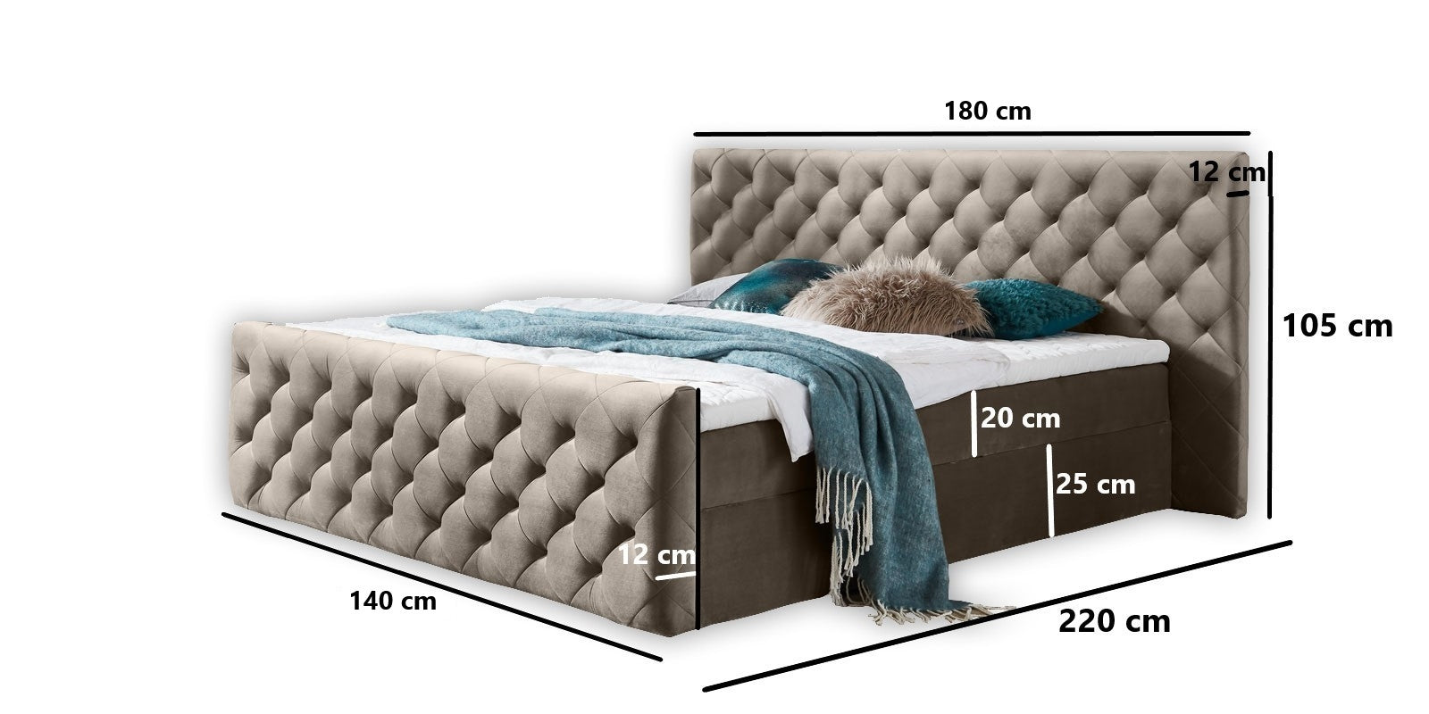 Pour matelas 200 x 140 cm : Longueur : 220 cm, Largeur lit : 140 cm, Largeur tête : 180 cm, Hauteur tête : 105 cm, poids : 110 kg