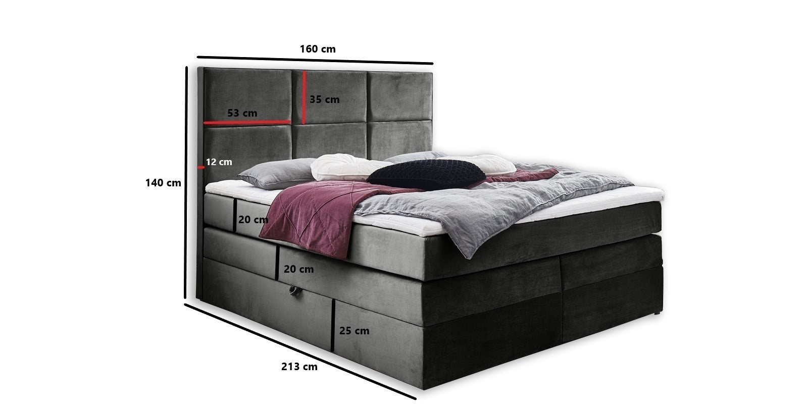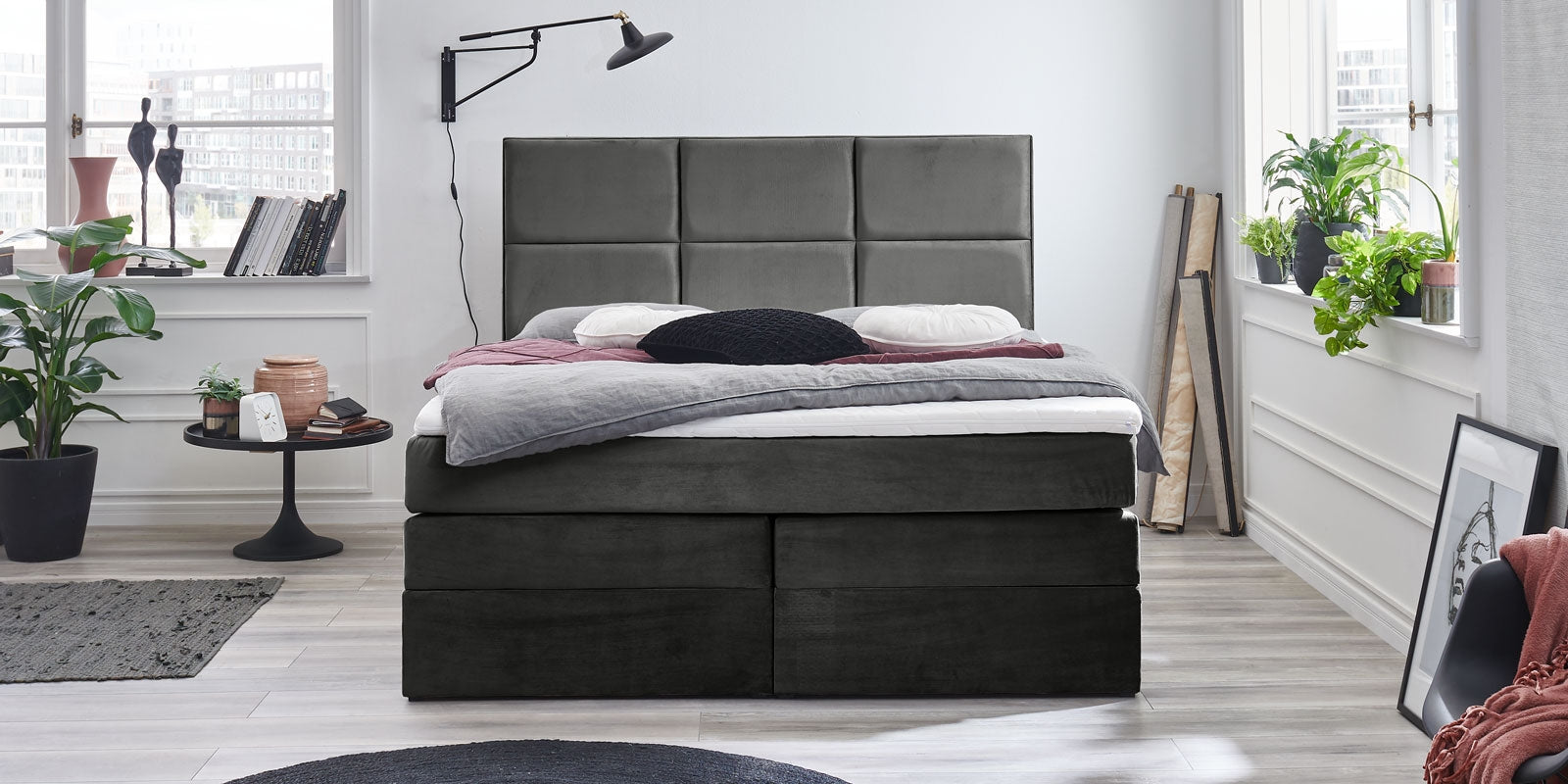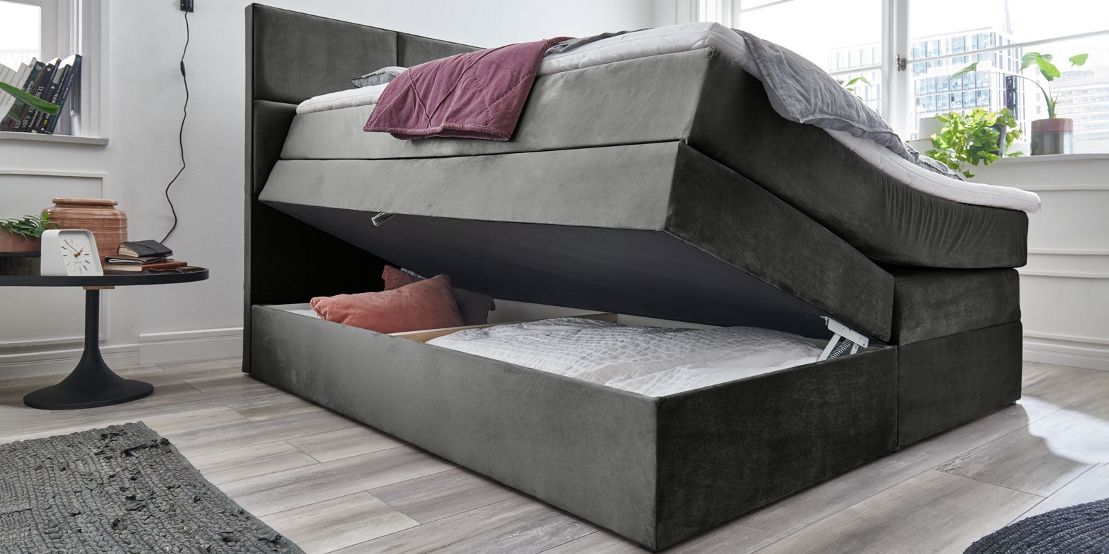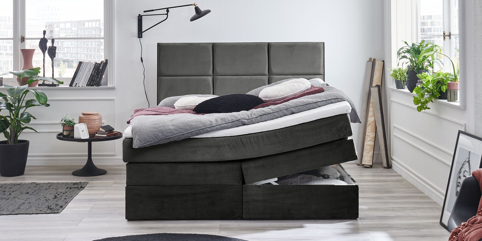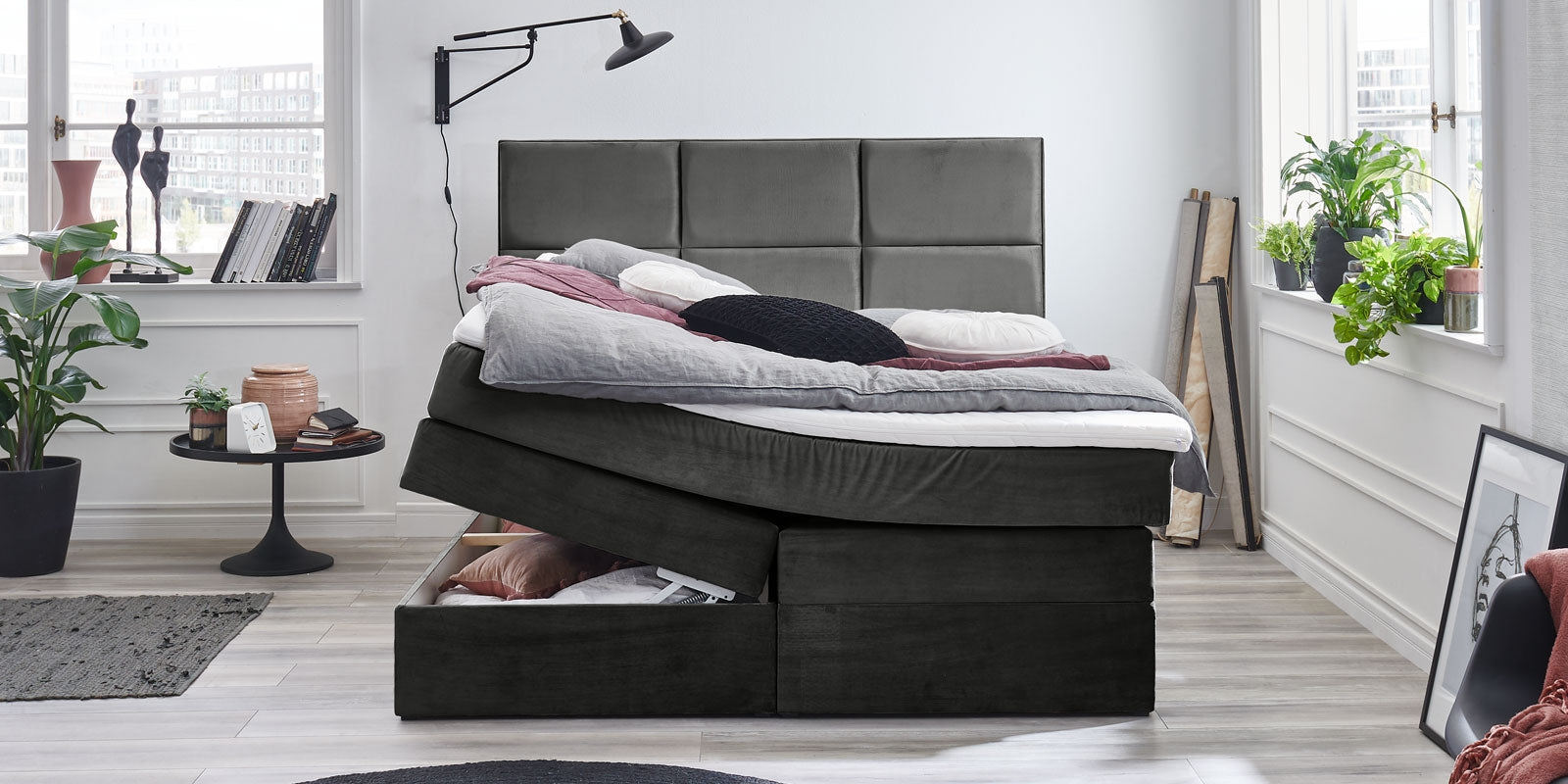 Les lits Boxspring offrent du confort en remplaçant le cadre et les lattes par une structure en bois massif de la meilleure qualité, le matelas à ressorts Bonell et le matelas à ressorts ensachés, qui forment le coffre.