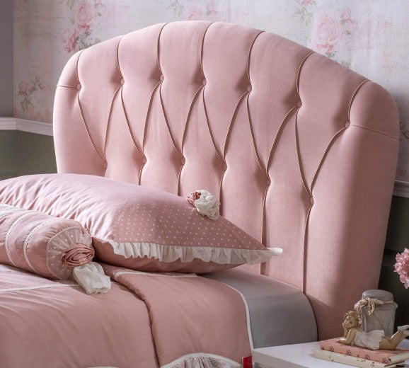La tête de lit est recouverte de tissu.