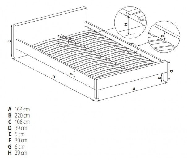 Pour le matelas 200 x 160 cm : Longueur : 220 cm, largeur : 164 cm, Hauteur de tête : 106 cm, Poids : 103,5 kg