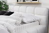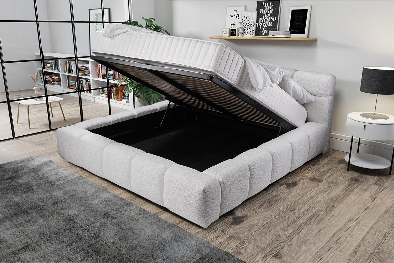 Le lit contient un cadre de lit rabattable grâce au système de vérin à gaz, permettant l'accès au coffre de rangement.